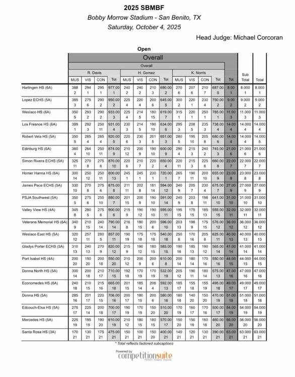 Regarding the judging inconsistencies from week to week: I think with the proliferation of BOA regionals, BOA has had to do some major recruiting in recent years. We've seen a lot of new names on the panels. With that comes some growing pains, I guess you could call it -- or maybe even just new perspectives. Many of the newcomers do have experience from WGI or DCI, but it's not exactly the same. Of course, my heart goes out to bands like Cy-Fair, who bear the brunt of the bizarre shifts. They have every right to be frustrated and disappointed.6 points -