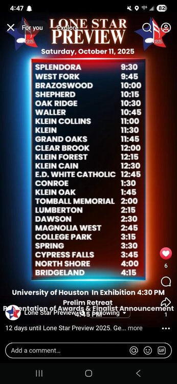 I'm gonna do a full ranking list with the ranges of placements I can see each band get. And yes, I am aware that some folks out there will disagree with me. 👍 Bridgeland (1st - 3rd) North Shore (1st - 5th) College Park (2nd - 5th) Tomball Memorial (3rd - 6th) Clear Brook (3rd - 7th) Dawson (4th - 7th) Klein Collins (6th - 8th) Oak Ridge (7th - 10th) Grand Oaks (9th - 12th) Klein Oak (9th - 12) Klein Cain (10th - 13th) Conroe (11th - 14th) Spring (12th - 15th) Magnolia West (12th - 16th) Klein (12th - 16th) Lumberton (12th - 16th) Klein Forest (14th - 18th) Cypress Falls (15th - 20th) Waller (14th - 20th) Brazoswood (13th - 21st, Only because they have been declining. Sorry!) Splendora (18th - 23rd) E.D. White Catholic (20th - 24th) West Fork (20th - 24th) Shepherd (21st - 24th) -