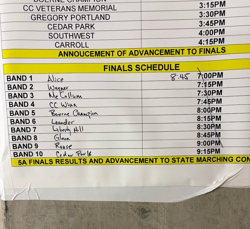McCollum, CC Winn, Alice, Wagner, Glenn, Leander, Rouse, Liberty Hill, Champion, Cedar Park. -