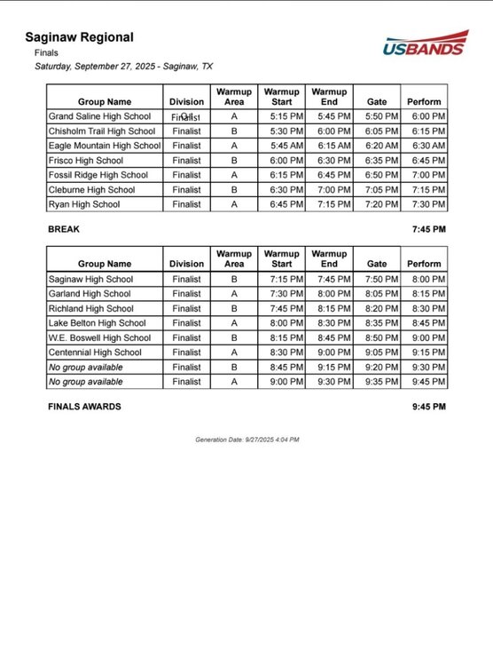 Re: finals results. I'm a little puzzled to see Fossil Ridge so low. But I'm happily surprised to see a strong showing from Boswell. We also saw a Richland prelims-to-finals bump -- so congrats to them on another top-3 contest finish. And congrats to Burleson Centennial on another contest win! This bodes well for them, especially when auxiliary captions count at UIL. It's too bad Richardson had to cancel and V.R. Eaton had other obligations. A semi-educated guess is that Richardson, Garland, and V.R. Eaton would have filled out 5th-7th had they all been in finals. Re: prelims results. Follow link: https://usbands.org/events/files-events/1000/1128/SAGINAW-PRELIMS-RESULTS.pdf It looks like Krum withdrew, in addition to Richardson's cancelation! Looks like Lake Belton and Richland were "tied" for 3rd (tie broken in favor of Lake Belton), and V.R. Eaton was in 6th (behind Garland but ahead of Saginaw). -